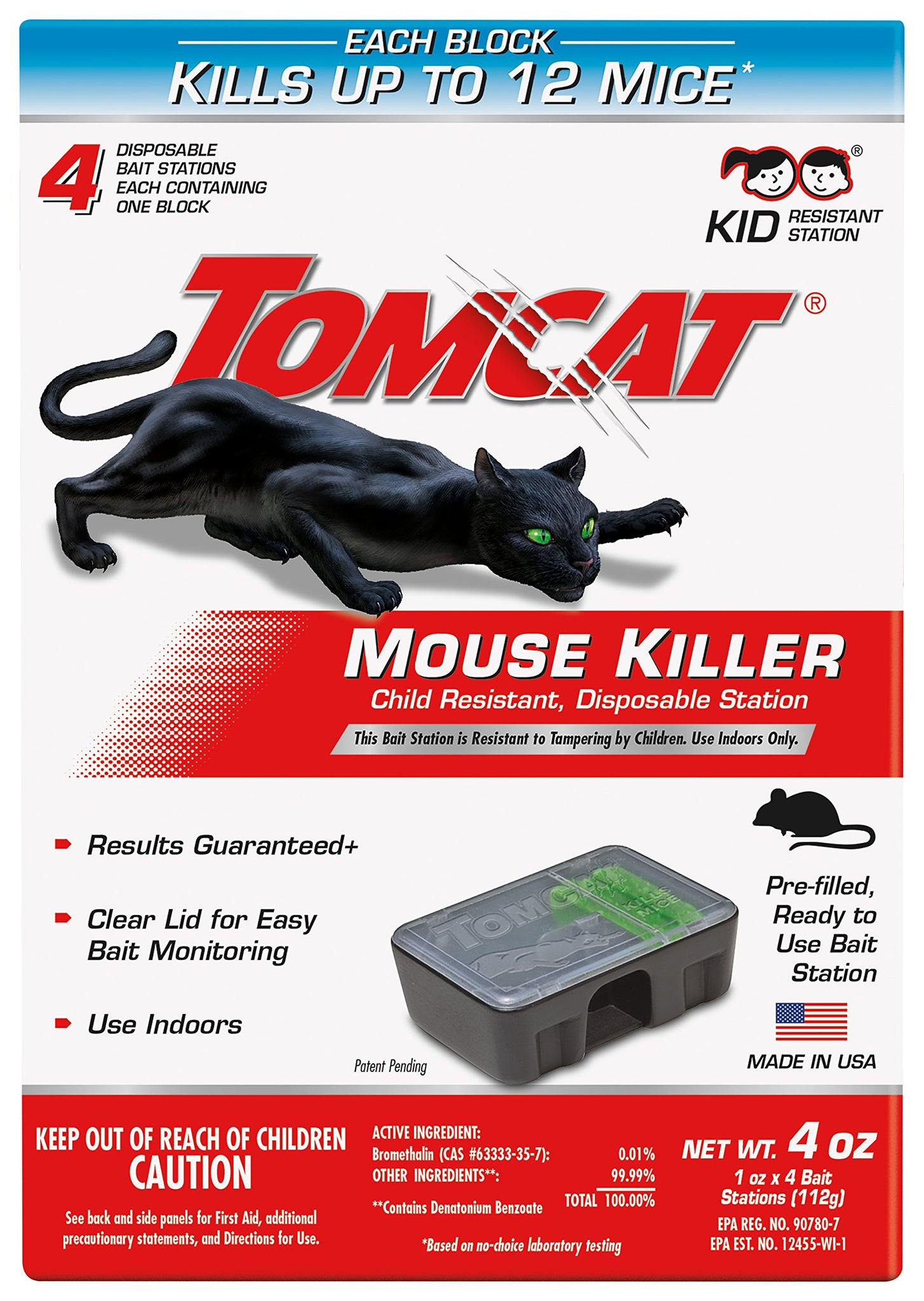 Tomcat Mouse Killer Child Resistant, Disposable Station effectively kills up to 12 mice with one bait block while providing effective station security. The disposable station is resistant to tampering by children and gives mice easy access to the bait. The bait station is for indoor use only. Based on no-choice laboratory testing.