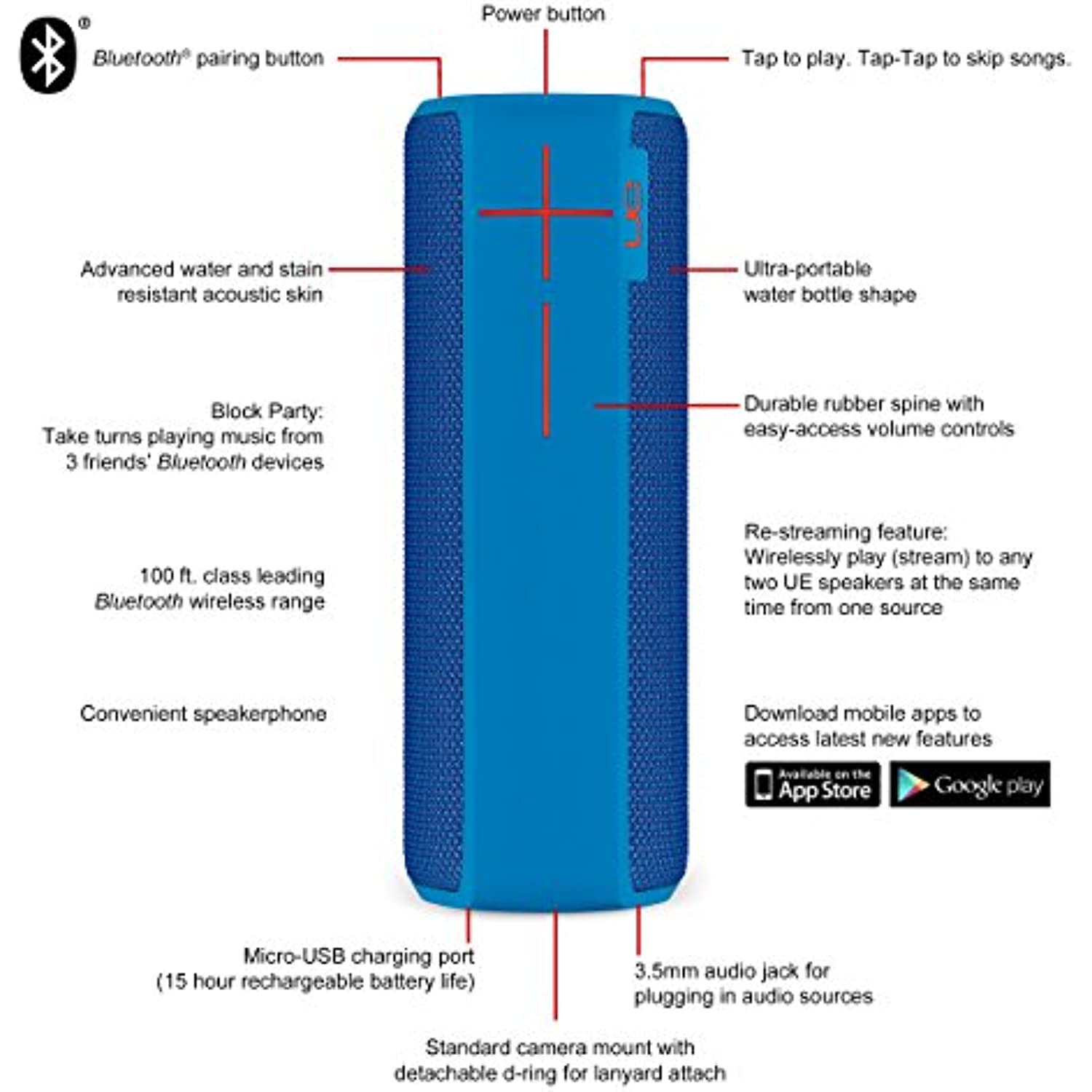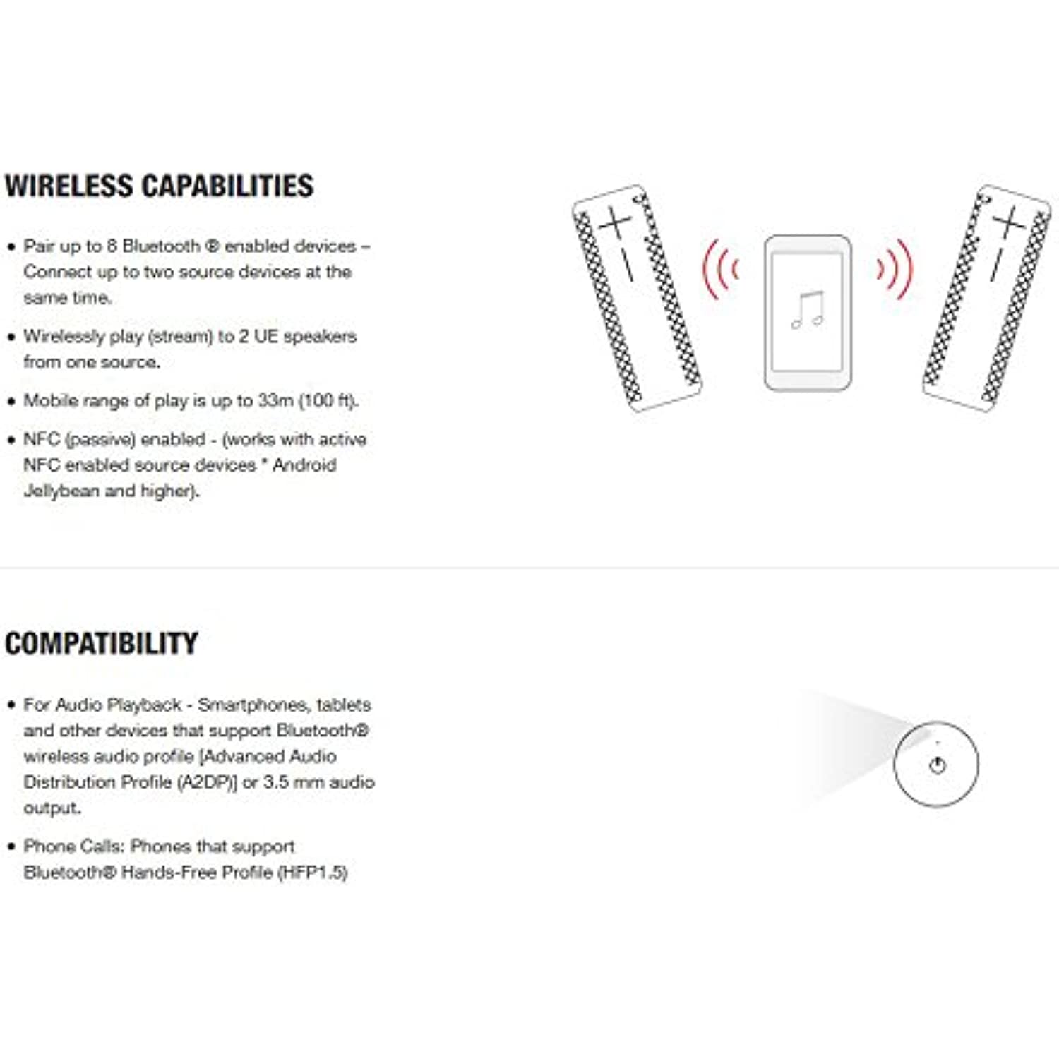 Ultimate Ears BOOM 2 is the 360-degree wireless speaker that blasts loud, insanely great sound with deep, powerful bass in every direction–everywhere you go. It was designed to get wet, muddy, and beat up. PartyUp allows you to wirelessly connect to up to 50 Ultimate Ears speakers and takes your party where no other sound system can go. Caves. Mountains. Lakes. Rooftops. You name it. It's waterproof*, shockproof and crafted from the sexiest and most uninhibited premium materials in the known universe. And with Siri + Google Now voice integration***, you just open your mouth and use your words — so instead of reaching for your phone, you can pick up BOOM 2 so nothing comes between you and the music. *IPX7-rated waterproof (up to 30 minutes and a depth of 1 meter). ** Requires latest firmware & software update. For NFC-enabled devices, hold your device directly against the UE BOOM 2, as shown, to pair and connect.