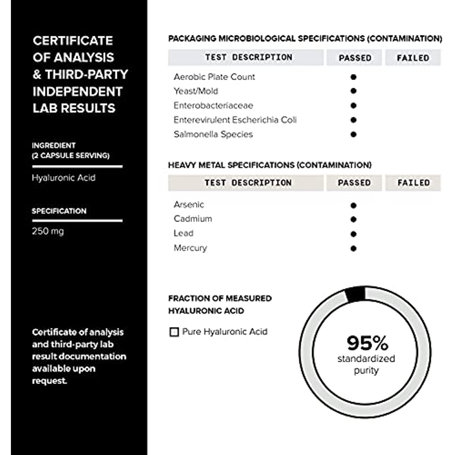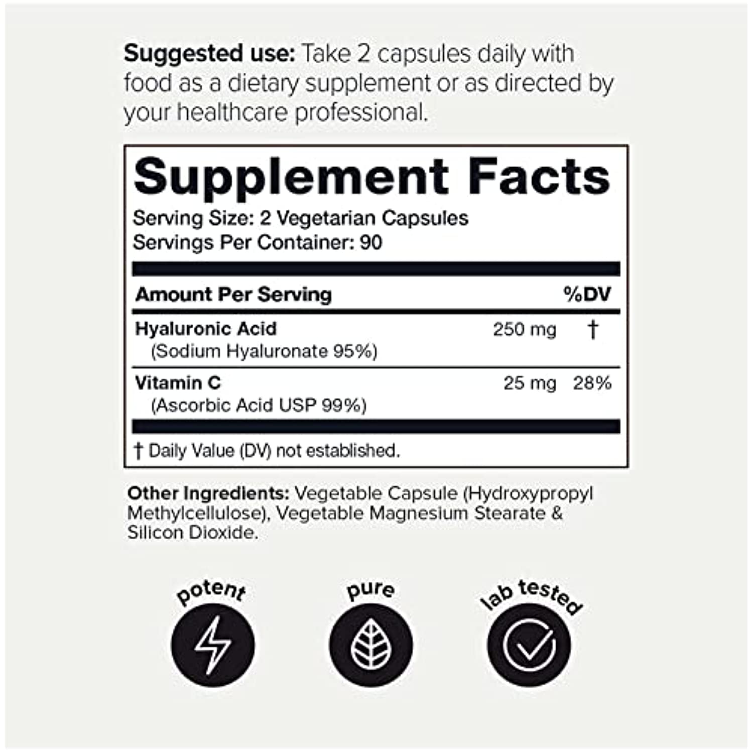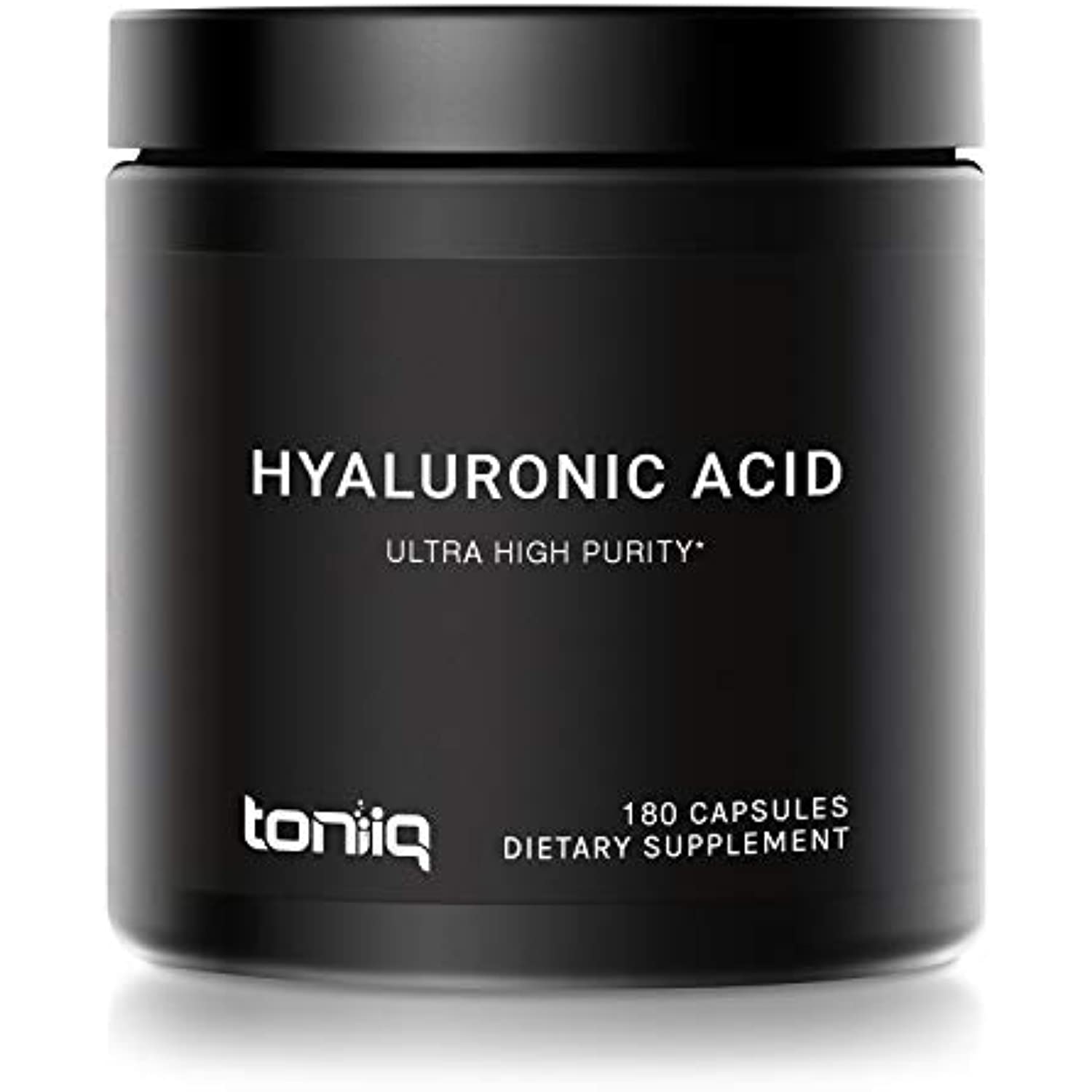 - The Highly Purified Form of Hyaluronic Acid - Toniiq Hyaluronic Acid capsules contain 250mg of the highest quality hyaluronic acid powder in each serving – ethically sourced, grown and produced using a fermented production process to ensure 95% standardized purity (other hyaluronic acid supplement products won't disclose their level of purity).