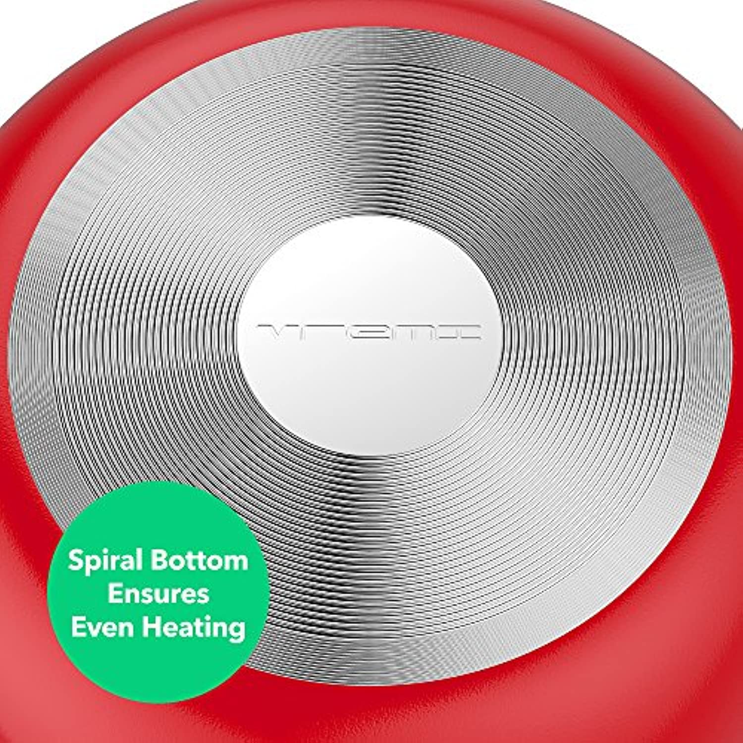 Whether you sauté, fry, sear, or make sauces, the Vremi Sizzlesauraus Sauté Pan handles all the heat in the kitchen. With its 5 quart capacity and 12 inch diameter, it can accommodate everything from small omelettes to big family stir fry meals. Includes tempered glass lid and heat-resistant bakelite handle for easy maneuvering while cooking. Crafted from durable, non toxic aluminum with double-layer non-stick interior, enameled exterior, and spiral bottom for even heating. Dishwasher safe for effortless cleaning. Product Details & Care